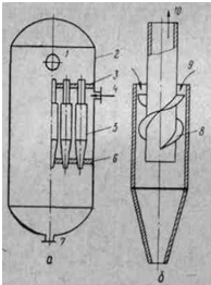 пылеуловителя; б - элемент циклонного пылеуловителя; 1 - патрубок для выхода
