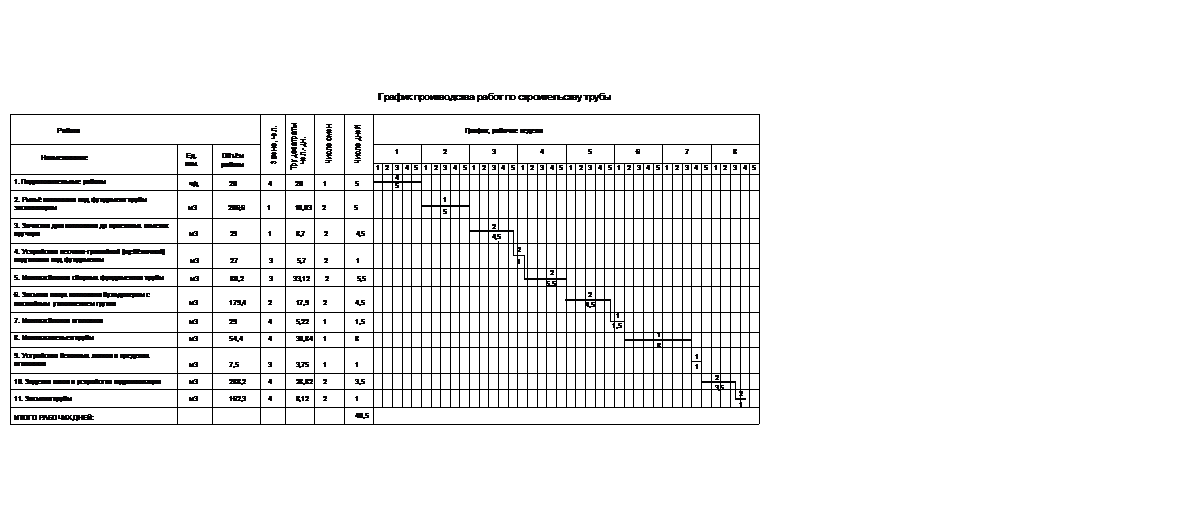 Строительство трубы включает производство следующих строительных работ: подготовка строительной площадки, устройство котлована, возведение фундамента трубы, монтаж блоков оголовков и звеньев трубы, устройство гидроизоляции, засыпка трубы грунтом, укрепление русла и откосов насыпи. При этом технологическое проектирование производстве работ обычно представляет собой разработку технологической карты на сооружение трубы [1].