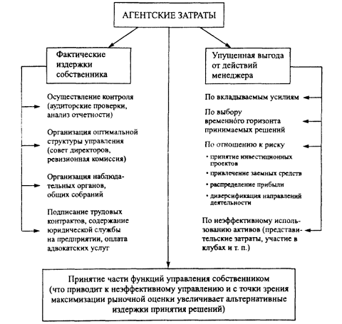 Агентские затраты представляют собой разницу между фактической оценкой компании и потенциальной, гипотетической ее ценностью, которая бы существовала в более совершенном мире, где интересы менеджеров и собственников полностью совпадали бы.