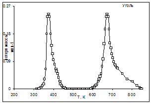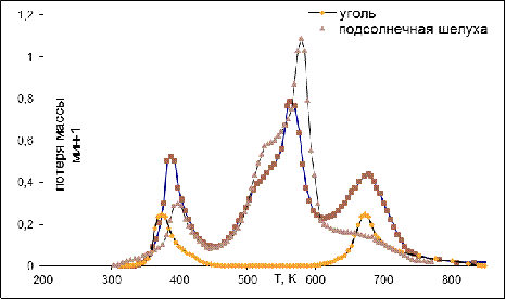 потери массы (ДТГ-кривые) пересчитывали на 1 г исходного образца и выражали их