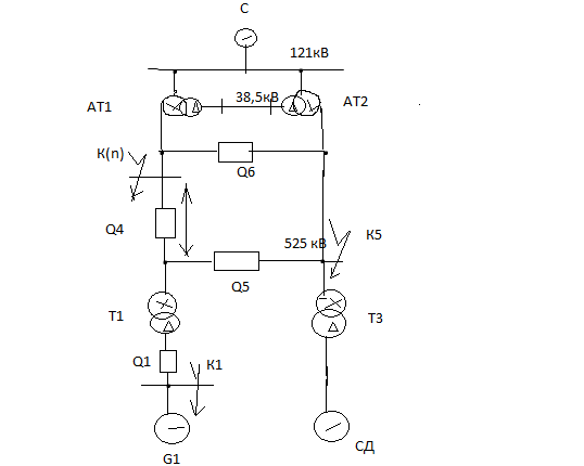 2. Определить сверхпереходный и ударный токи трехфазного короткого замыкания в точке К(3) заданной схемы. Определить методом типовых кривых периодическую слагающую тока.