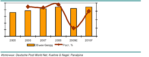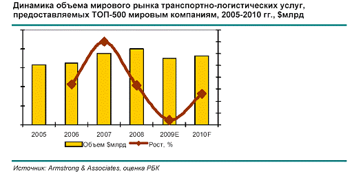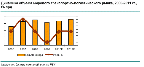 По оценкам международных исследовательских агентств, под влиянием глобального кризиса в 2008 г. темпы прироста мирового транспортного рынка снизились до 7%, а по итогам 2009 г. его объем сократился, вот в 2010 г. ожидается его рост.