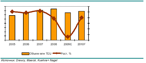 По данным Drewry, объем мирового рынка морских контейнерных перевозок в 2008 г. составил 148 млн TEU2. Под влиянием глобального кризиса темпы роста контейнерных перевозок снизились до ХХ% в 2008 г. (по сравнению с 10% в 2005-2007 гг.).