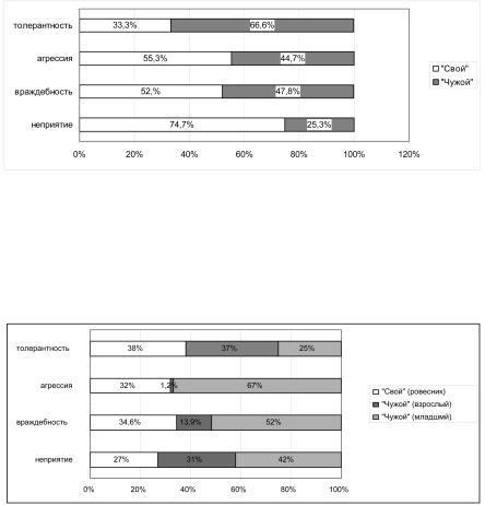 го поведения. Напротив, категория «чужого» оценивается весьма амбивалентно: если в роли «чужого» выступает взрослый, то проявления интолерантности затруднены; если же в этой роли оказывается младший, то во взаимодействии с ним проявления интолерантности не только в принципе возможны, но даже допустимы в большем количестве, чем с ровесником.