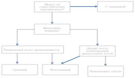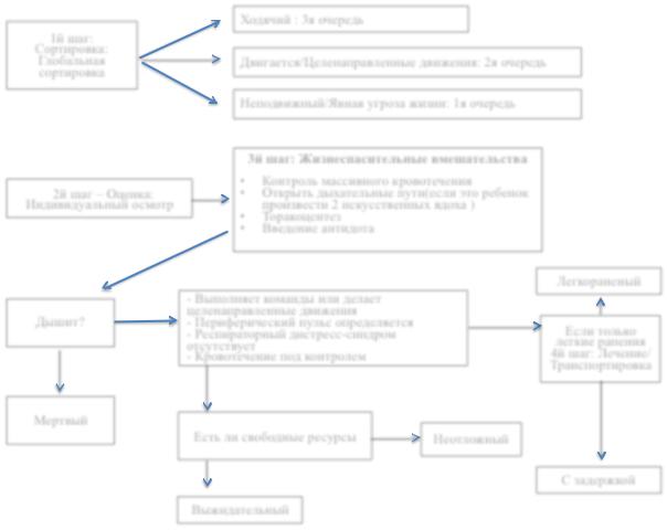 ченное количество жизнеспасающих вмешательств - остановку кровотечения и восстановление проходимости дыхательных путей. Затем пострадавшие сортируются по приоритету оказания помощи с присвоением категорий: «неотложный», «с задержкой», «выжидательный», «легкораненый», «умер-