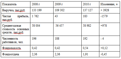 По данным таблицы 2.1 можно сделать вывод, что в 2010 г. по сравнению с 2008 г. выручка увеличилась на 3928 тыс.руб., так как у предприятия был только данный объем работ, соответственно, чистая прибыль уменьшилась на 1579 тыс.руб., увеличилась стоимость основных средств на 978 тыс.руб.