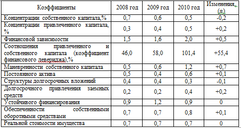 Коэффициент маневренности собственного капитала хороший, т.к. уровень коэффициента составляет 0,5 в 2008, 0,6 в 2009 и 1,2 в 2010 годах. Это значит, что собственных средств, вложенных в текущую деятельность больше, чем капитализированных.