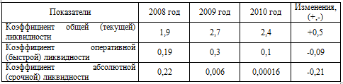 Таблица 2.3 - Показатели ликвидности ГУП ДХ "Заринское ДСУ-2" за 2008 - 2010 гг.