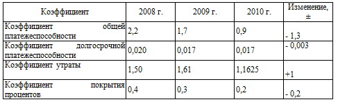 С учетом того, что коэффициент платежеспособности принимает значение в пределах 1, можно сказать, что на 2010 год предприятие неплатежеспособно.