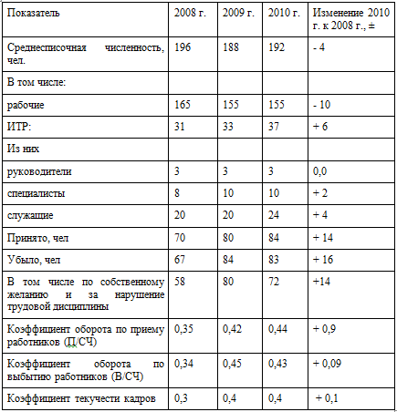 Таблица 2.7 - Анализ обеспеченности и движения трудовых ресурсов в ГУП ДХ "Заринское ДСУ-2" в 2008-2010 гг.