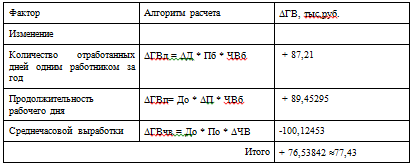 Таким образом, за счет увеличения отработанных одним работником дней среднегодовая выработка продукции 1 работником увеличилась на 87,21 тыс.руб., за счет увеличения продолжительности рабочего дня на 1 час увеличилась на 89,45295 тыс.руб., за счет уменьшения среднечасовой выработки 1 работником на 0,029 тыс.руб. уменьшилась на 100,12453 тыс.руб., что в целом составило 77,43 тыс.руб.