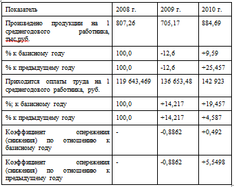 Как видим из данных таблицы 2.12, в 2009 г. наблюдалось снижения темпа роста производительности труда на 0,8862, в то время как в 2010 г. произошло повышение на 0,492 по отношению к 2008 году и на 5,5498 по отношению к 2009 году, что говорит о том, что в ГУП ДХ производительность труда неравномерна: то понижается, то повышается.