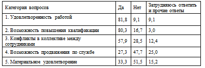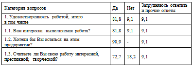 Для проведения исследования удовлетворенности работой нами была разработана анкета, которая предлагалась для заполнения работникам предприятия, содержит 19 вопросов. Вопросы можно разделить на 6 общих категорий (Приложение В).