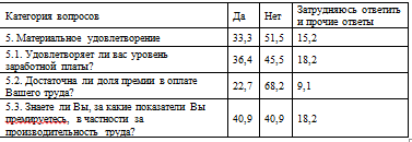 Как видно из таблицы 2.20, сотрудники не знают, из расчета чего они получают заработную плату. Кроме того, высокий процент работников не имеют удовлетворенности от материальной стимуляции труда.