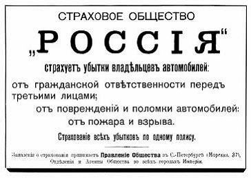 В Россию первый автомобиль привезли в С-Петербург в 1895 году, а москвичи увидели его в 1899 году. Почти сразу после появления "самодвижущихся экипажей" на российских дорогах началось их страхование. В 1902 году страховой журнал отмечал, что автомобили становятся необходимым средством передвижения, и их владельцы нуждаются в страховании, но "к сожалению, им нелегко удовлетворить эту нужду".
