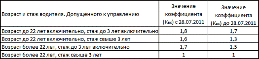 Коэффициенты ОСАГО 2014, возраста и стажа допущенных водителей: