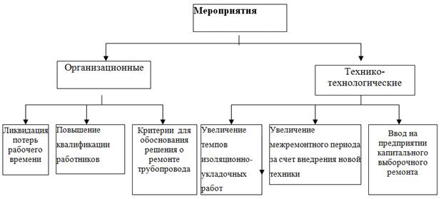 Как уже было отмечено, что критерием для оценки эффективности ремонтных работ должно стать качество. А соответственно результатом и оценочным показателем станет срок окупаемости ремонта и увеличение межремонтного периода. В данном случае оснащение предприятия новой техникой и применение новых технологий при осуществлении ремонтных работ позволит повысить эксплуатационные характеристики трубопроводной системы. Положительное влияние управленческих мероприятий оценить очень сложно, но, по мнению экспертов, положительный результат на половину зависит от адекватности, правильности и своевременности принятия решения по возникшей проблеме. Выявленные резервы, в той или иной степени влияют на увеличение коэффициента производительного времени и уменьшение длительности одного ремонта. Однако комплекс мер должен включать те предложения, которые предприятие сможет провести в планируемом периоде для увеличения количества капремонтов. Так, предлагаемые мероприятия по повышению эффективности производства Кондинского ЛПУ МГ представлены на рис. 3. Факторы, оказывающие влияние на рациональное использование трудовых ресурсов можно объединить в четыре группы: организационно- технические, экономические, социальные и оздоровительно-профилактические. Совершенствование технологии имеет значение лишь тогда, когда создаются соответствующие организационные условия, трудовая деятельность людей объединена в определенную систему. До последнего времени меньше внимания уделялось социально-экономическим факторам, которые также обуславливают рациональное использование рабочего времени. Современный уровень развития производства и рост культурно-образовательного и технического уровня работающих не позволяет ограничиваться только материально-техническими и организационными факторами. 2. Методические положения по совершенствованию организации