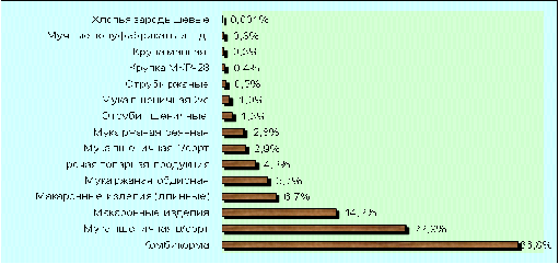 Основной объем экспорта приходится на муку ржаную обдирную (85,2%). На муку пшеничную 1 сорта объем экспорта составил 6,3%, на макаронные изделия - 5,9%, муку пшеничную 2 сорта - 2,6%.