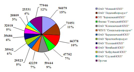 По объемам производства и реализации мукомольной продукции УП «Борисовский комбинат хлебопродуктов» входит в тройку лидеров среди организаций Департамента по хлебопродуктам. Конкуренцию комбинату составляют лишь ОАО «Минский комбинат хлебопродуктов» и ОАО «Лидахлебопродукт» (рисунок 3.2).
