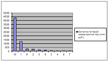 10 товарных позиций, для каждой из которых дан остаток готовой продукции на