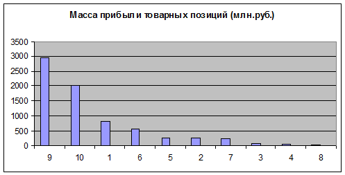 10 товарных позиций, для каждой из которых определена масса прибыли (млн.