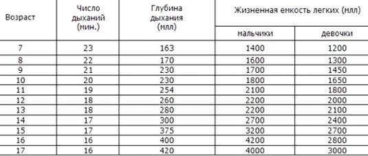 Таблица 1. Частота, глубина дыхания и жизненная емкость легких у здоровых детей (средние данные по Н.А. Шалкову)