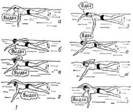 Рис.1. Техника плавания способом кроль (вид сбоку). Где а, ж, з - одна рука гребёт, другая проносится вперёд над водой, б - первая часть гребка рука в лучезапястном суставе согнута, д - для вдоха голова поворачивается в сторону (вправо или влево), е- ладонь в конце гребка по направлению к бедру