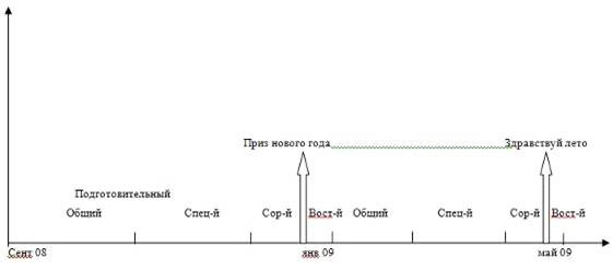 Подготовительный период. Первый этап - сентябрь, 1я, 2я недели октября. Второй этап - 3я, 4я недели октября, ноябрь. Соревновательный период (период участия в соревнованиях «Приз Нового Года») - декабрь. Переходный период - 1 и 2-я недели января.