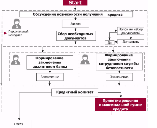 В качестве иллюстрации на рис. 2 приведен пример бизнес-процесса работы сотрудника банка по кредитной заявке - от первого контакта с клиентом до принятия банком предварительного решения о предоставлении потребительского кредита на определенную сумму. Видно, что тут основную роль в снижении рисков до минимума играет согласованная работа всех сотрудников банка в соответствии с утвержденной схемой принятия решения.