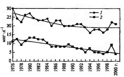 В 1976-1980 гг. содержание фосфора в воде повысилось до 26 мкг/л. Концентрация кислорода в зимний период в глубоководных районах понизилась не только у дна, но и на поверхности.