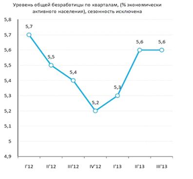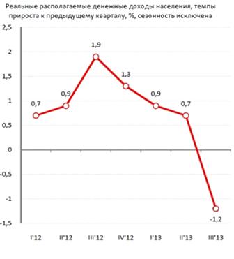 Реальные денежные доходы населения, темпы прироста к предыдущему кварталу в 2012-2013 гг.