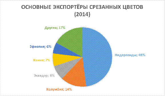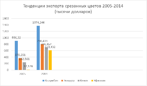 В 2014 году наблюдается значительный рост экспорта цветов: Колумбия на 3%, Эфиопия на 16%, а также наиболее быстро развивающаяся Кения на 46% по сравнению с 2013 г. Однако, с другой стороны, в Эквадоре произошло сокращение на 5%.