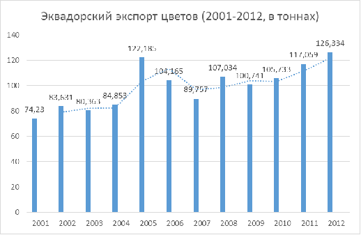 Рисунок 6.Эквадорский экспорт цветов (2001-2012, в тоннах)
