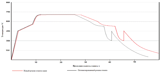 Данная технология позволяет получать готовую продукцию, соответствующую требованиям нормативной документации по всем параметрам и удовлетворяющую требования потребителя, однако приводит к снижению производительности печей. В связи с этим необходима корректировка разработанной технологии для поиска оптимального соотношения между производительностью печей и качеством продукции. Применение более высокой температуры позволит сократить время отжига и повысить производительность. Новая технология представлена в таблице 1.6.