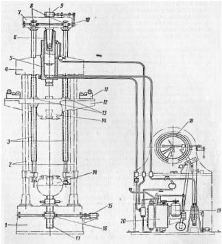 - основание; 2 - колонны; 3 - винты, передающие нагрузку образцу; 4 -