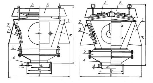 Общий вид КДС-1500 (рисунок-1,слева), КДС-3000 (рисунок-1,справа): 1 - корпус; 2 - тарелка вакуума; 3 - тарелка давления у КДС-1500 (два седла давления у КДС-3000); 4 - переходник; 5 - кассета огневого предохранителя; 6 - крышка; 7 - воздуховод.