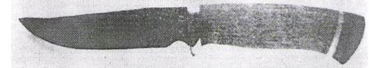 3.Для решения вопроса об удобстве и безопасности удержания в руке исследуемого в момент нанесения удара, проверки прочности его конструкции и поражающих свойств, ножом неоднократно (до 30 ударов) с возрастающей силой наносились колюще-режущие удары в сухую сосновую доску толщиной в 50 мм поперек волокон, при различных положениях ножа в руке. При этом установлено, что при нанесении колющих ударов, его боевой конец проникает в древесину на глубину до 12 мм, его рукоять удобна и безопасна в момент нанесения ударов, разрушений его конструкции в целом и отдельных его деталях не имеется.
