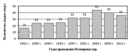 Особый интерес вызывает изучение программ Всемирных игр. С момента проведения первых соревнований (1981 г.) количество видов спорта, представленных в них, увеличилось более, чем в 2 раза. Особенностью формирования программы Всемирных игр, в отличие от олимпийской программы, является учет возможностей города-организатора провести состязания по тем или иным видам спорта. Это обуславливает динамичность соревновательной программы.