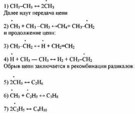 связи с образованием свободных радикалов, которые способны образовывать новый свободный радикал, отрывая атом водорода от молекулы исходного углеводорода: