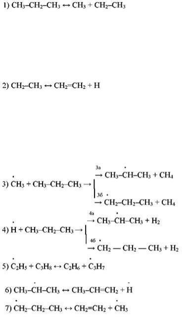 В случае пиролиза пропана на стадии продолжения цепи большую роль играют как радикал Н, так и метильный радикал СН3.