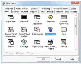 . Запускаем Delphi и создаем шаблон DLL-библиотеки, который предлагается по умолчанию. Для этого выполняем команду File → New → Other. Появляется окно New Items (рис. 9) со всевозможными шаблонами Windows-приложений и файлами Delphi (исполняемый EXE-файл, консольное приложение, форма или компонент Delphi и пр.). На вкладке New этого окна выбираем пункт DLL Wizard и нажимаем кнопку OK.