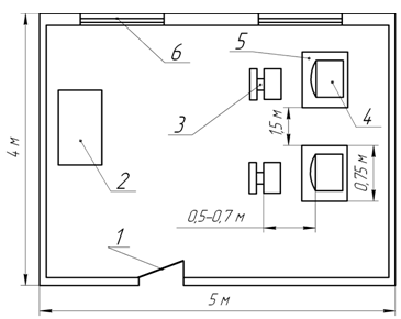 Рисунок 25 - Общий вид компьютерного класса: 1 - Входная дверь, 2 - Шкаф,
