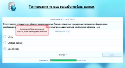 правильности ответа, о количестве попыток, времени прохождения теста. После