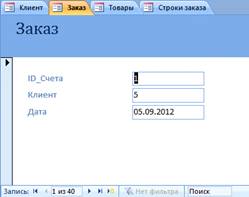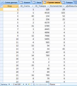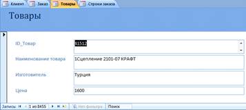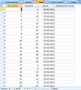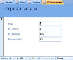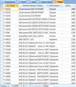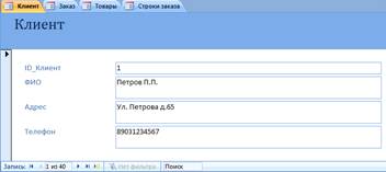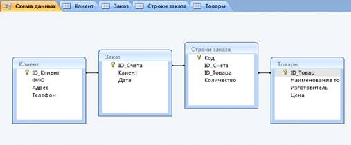 Рис. 1. Таблицы (Клиент, Заказ, Строки заказа, Товары) базы данных