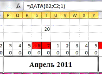 Р6:Y6 =ДАТА(B2;C2;1). Формат ячейки / все