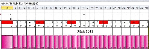 Создать таблицу=ДАТА($B$2;$C$2;СТОЛБЕЦ()-3).