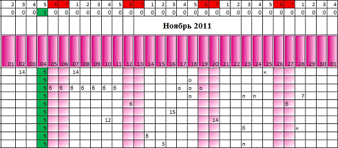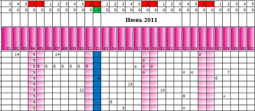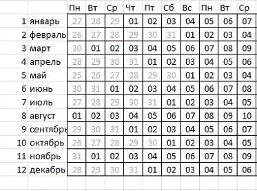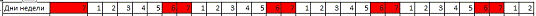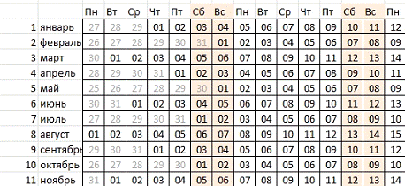 В итоге выходные дни обозначены розовым цветом,