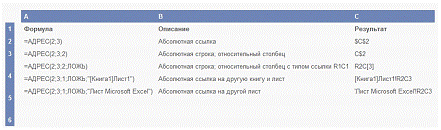 Функцию АДРЕС можно использовать для получения адреса ячейки на листе по номерам строки и столбца. Например, функция АДРЕС(2;3) возвращает значение $C$2. Еще один пример: функция АДРЕС(77;300) возвращает значение $KN$77. Чтобы передать функции АДРЕС номера строки и столбца, в качестве ее аргументов (Аргумент. Значение, предоставляющее информацию для действия, события, метода, свойства, функции или процедуры.) <javascript:AppendPopup(this,'ofArgument_2_2')> можно использовать другие функции (например, функции СТРОКА и СТОЛБЕЦ).