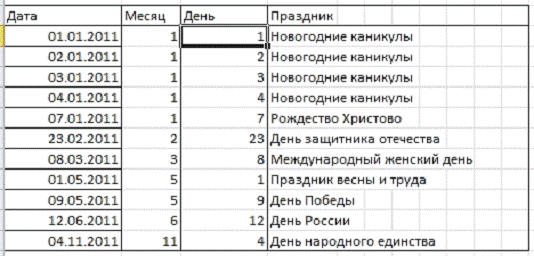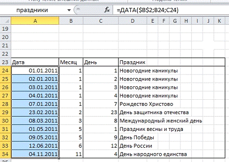Под табелем в ячейках А24:D34 создаем новую таблицу. Вводим номер месяцев, дней и названия праздников. В графу дата вводим в формулу =ДАТА($B$2;B24;C24). В2 - год, В24 - ссылка на месяц, С24 -день.