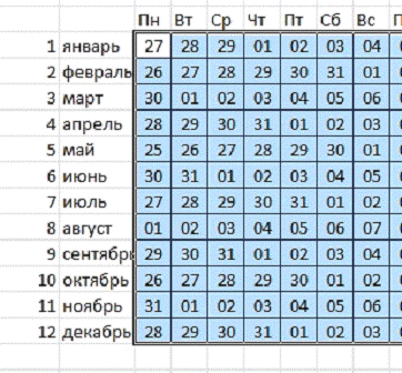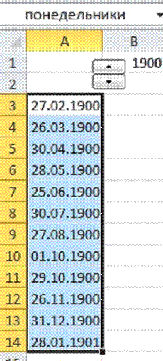 Протягиваем до А14 и присваиваем этому диапазону имя «понедельники». календарь константа учет счетчик